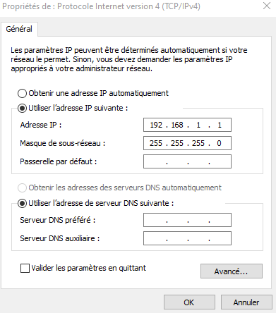 Une configuration manuelle de l'adresse IP de sa machine sera nécessaire ( Attention cette démarche est faite pour windows):