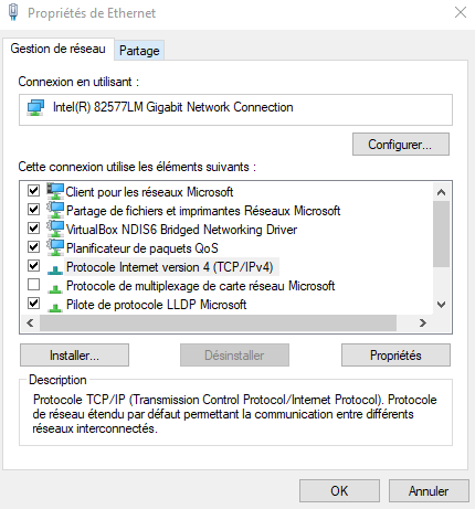 Ensuite pour changer l'adresse IP manuelle, il vous faudra aller dans les propriétés de Protocole Internet Version 4 (TCP/IPv4).