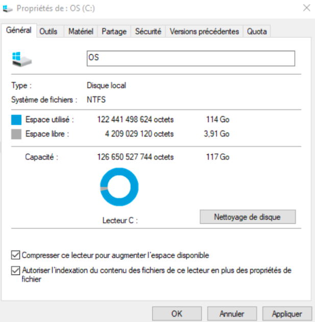 faites un clic droit sur C: > Propriétés, puis cochez la case "Compresser ce lecteur" pour augmenter l'espace disponible.