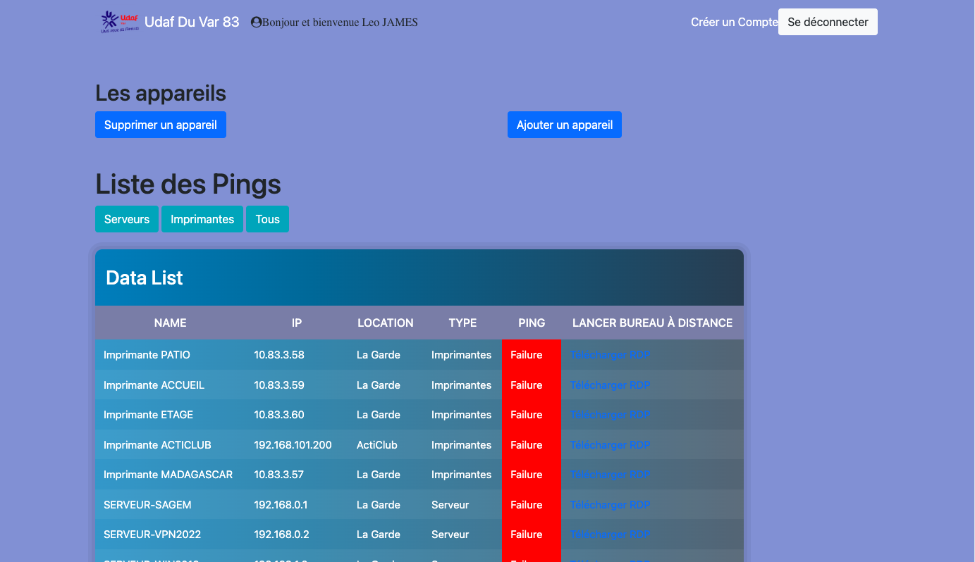 Le tableau de bord fournit des informations en temps réel sur l'état des serveurs et des imprimantes du réseau de l'entreprise. Les adresses IP sont enregistrées dans une base de données, assurant une gestion centralisée des informations critiques.
